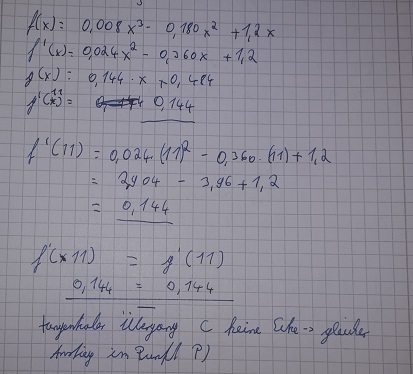 muss der Anstieg beider Funktionen im besagten Punkt P gleich sein.